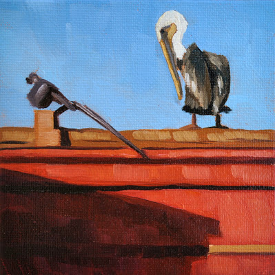 Pelican on a Red Roof - 4x4 February 05, 2013 • pelican painting • red roof • santa barbara Pelicans are so entertaining, and I loved the contrast of the shadows on this bright red building. Oil on canvas panel, 4x4 inchesSOLD ← Older Post Newer Post →