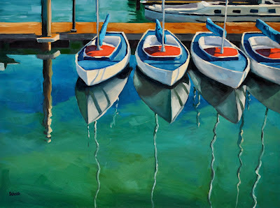 This piece was interesting to paint for several reasons. The reflections in the water are always a draw for me, but this one also had shadows from the boats on top of the water. I was a little nervous at first, how would I portray this effectively? But the secret to water is to just paint what you see.