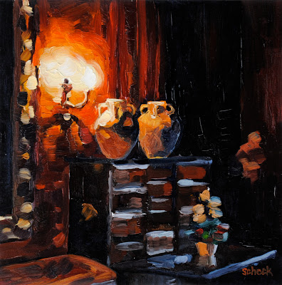 I'm working on a series of these interior scenes. I've always been attracted to this type of subject, but I don't always have a chance to paint them. A trip to the castle was a perfect solution! I liked this scene because of the orange glow coming from the light in the room, and the cool blue light from outside being reflected on the furniture.