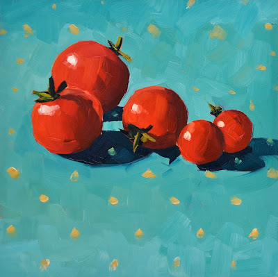 Starting a series of still lifes, just to change things up a bit. Here's the last of the tomatoes from my plants this year.
