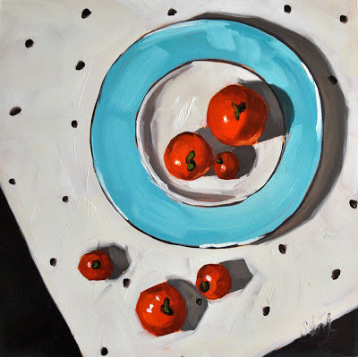 Tomatoes and the Turquoise Plate - 6x6 November 27, 2012 • still life • tomato Hope everyone had a wonderful Thanksgiving! I'm finally getting back into the groove of things, just in time to start the many Christmas commissions on my list. Oil on panel, 6x6 inches click here to view in shop ← Older Post Newer Post →