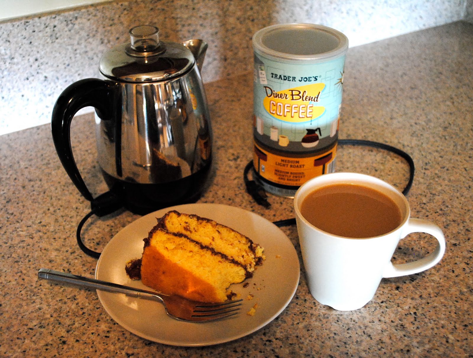 We didn't have a coffee maker, so my Mom brought me this one (and she was right it does make good coffee:) even though I think it's at least 30 years old. And it's my birthday so I'm allowed to have cake for breakfast...yum.