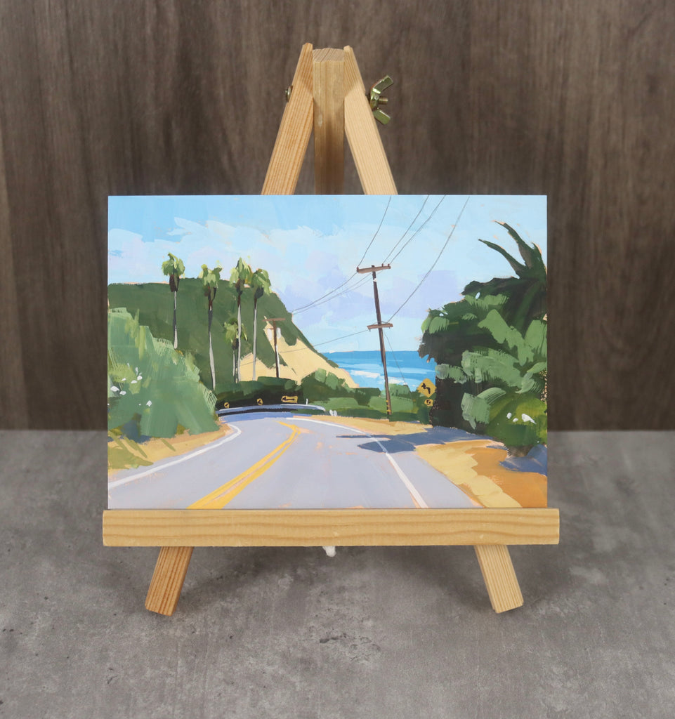 This painting measures 5x7 inches, and includes a white 8x10 mat (5x7 opening) backing board, and a clear plastic sleeve for protection.