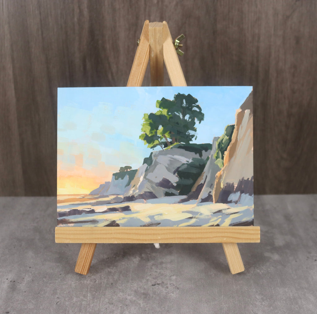 This painting measures 5x7 inches, and includes a white 8x10 mat (5x7 opening) backing board, and a clear plastic sleeve for protection.